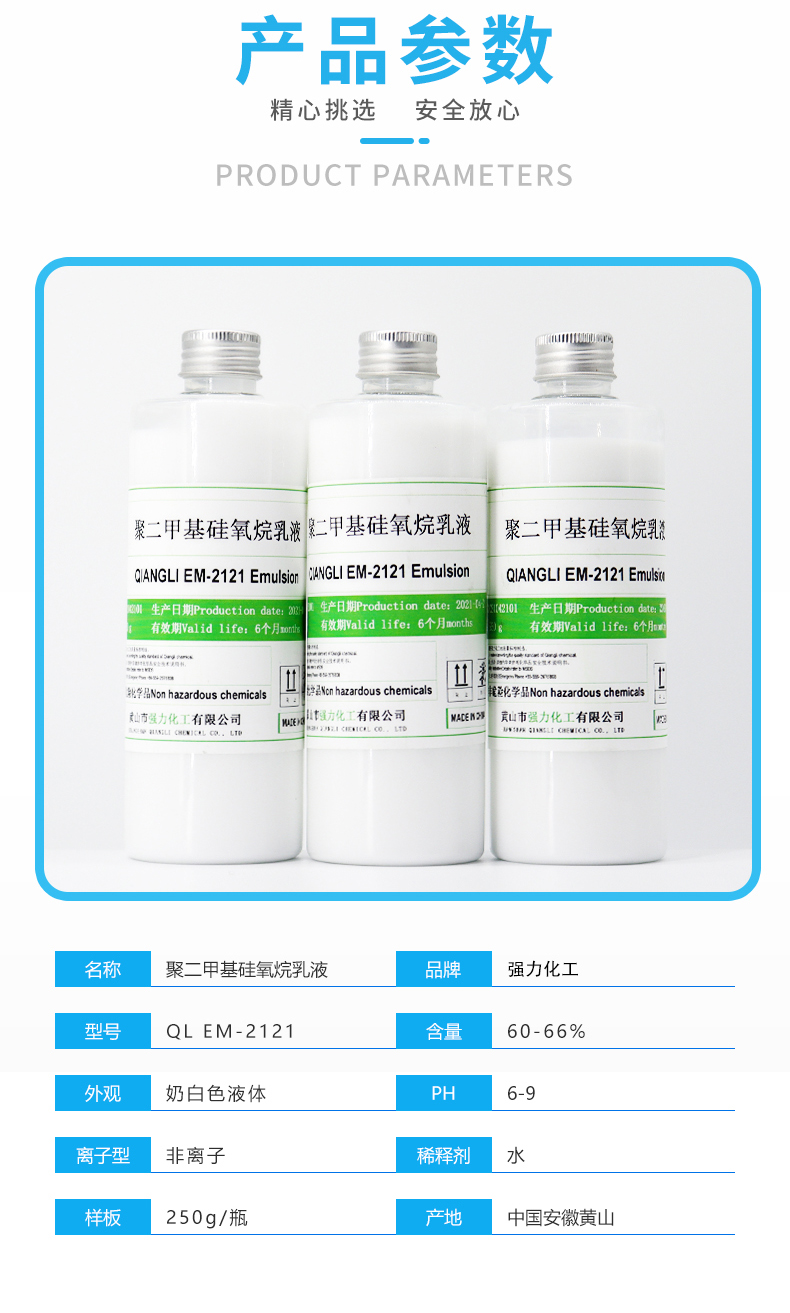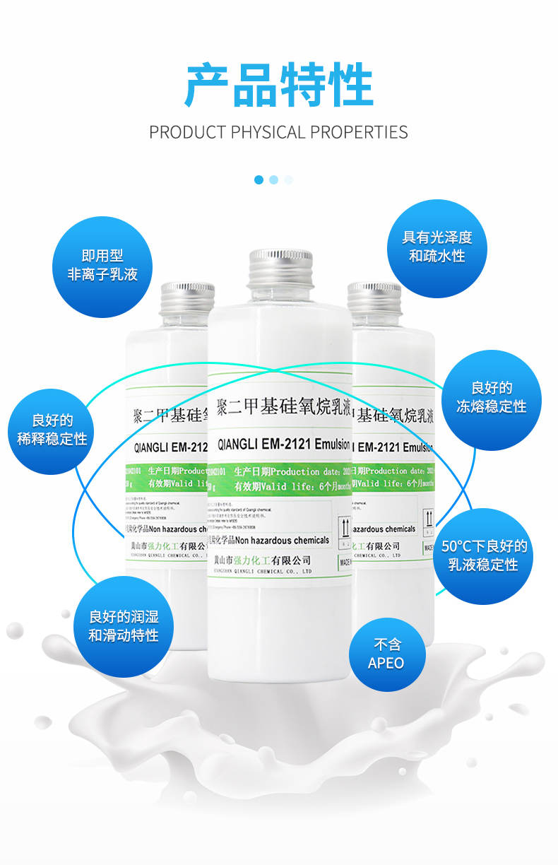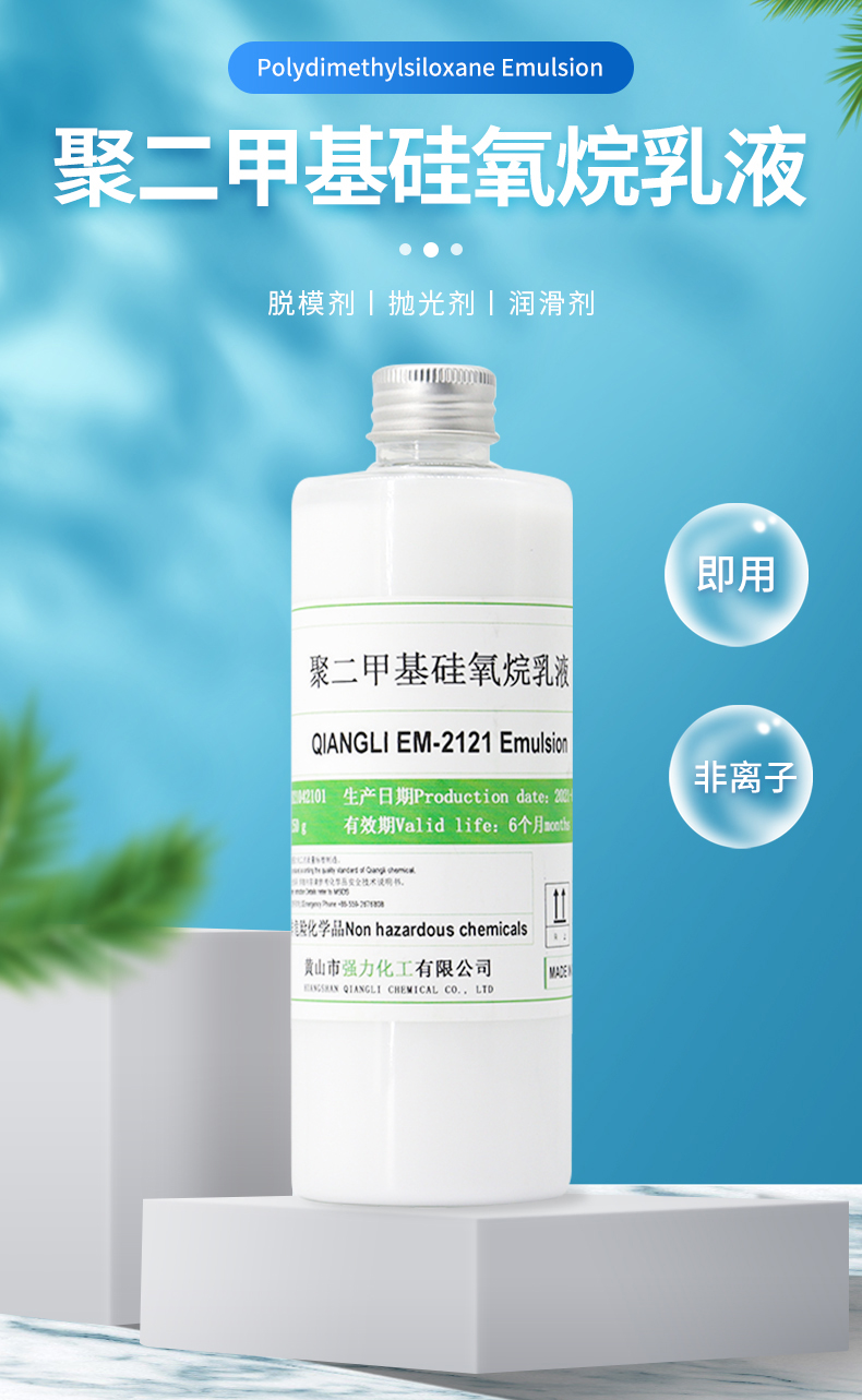 QIANGLI EM-2121 Emulsion是活性含量為60%的非離子聚二甲基硅氧烷乳液,因?yàn)槠浞请x子性,它可廣泛用于各種體系,如非離子,陰離子,陽(yáng)離子乳化體系或不形成復(fù)合體的聚合物體系,