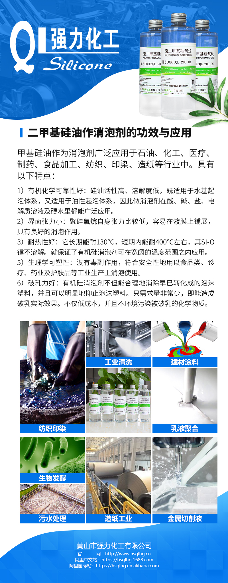 消泡劑(英文名稱Defoamers,Defoaming Agent)是一種助劑,其功能是消除在生產(chǎn)過(guò)程中物料形成的泡沫,有機(jī)硅消泡劑(英文名稱organic silicon defoamer)其主要組分為叫做硅油有機(jī)硅成分,硅油常溫下是不揮發(fā)的油狀液體,在水、動(dòng)植物油及礦物油中不溶,或溶解度很小,既能耐高溫,也能耐低溫?;瘜W(xué)性能惰性,物理性性能穩(wěn)定,無(wú)生物活性。