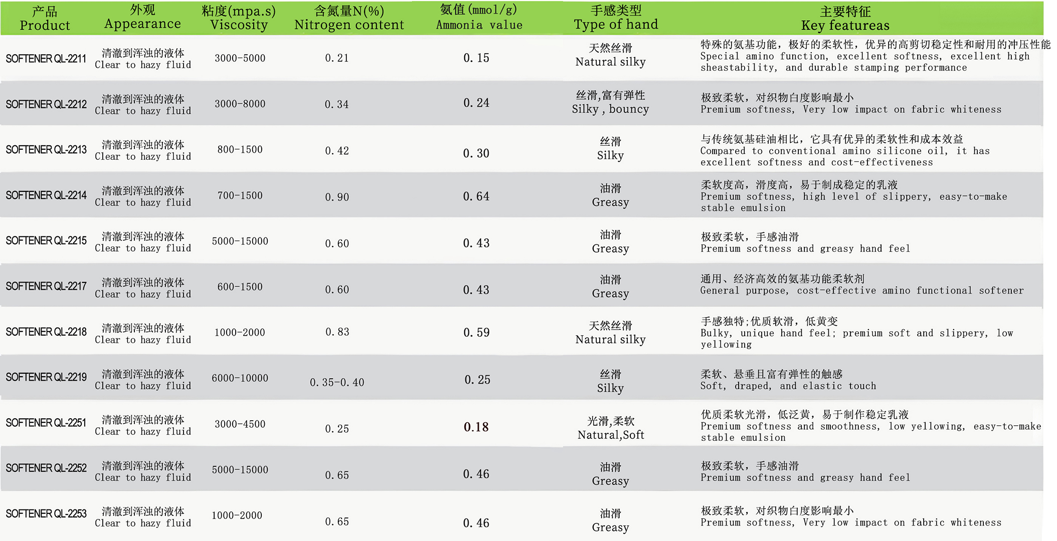 | QL-2215 | 強力化工 | 雙氨基值 0.42mmol/g,粘度5000-15000mPa.s | 線性結(jié)構(gòu),在尼龍表面形成均勻吸附膜 |