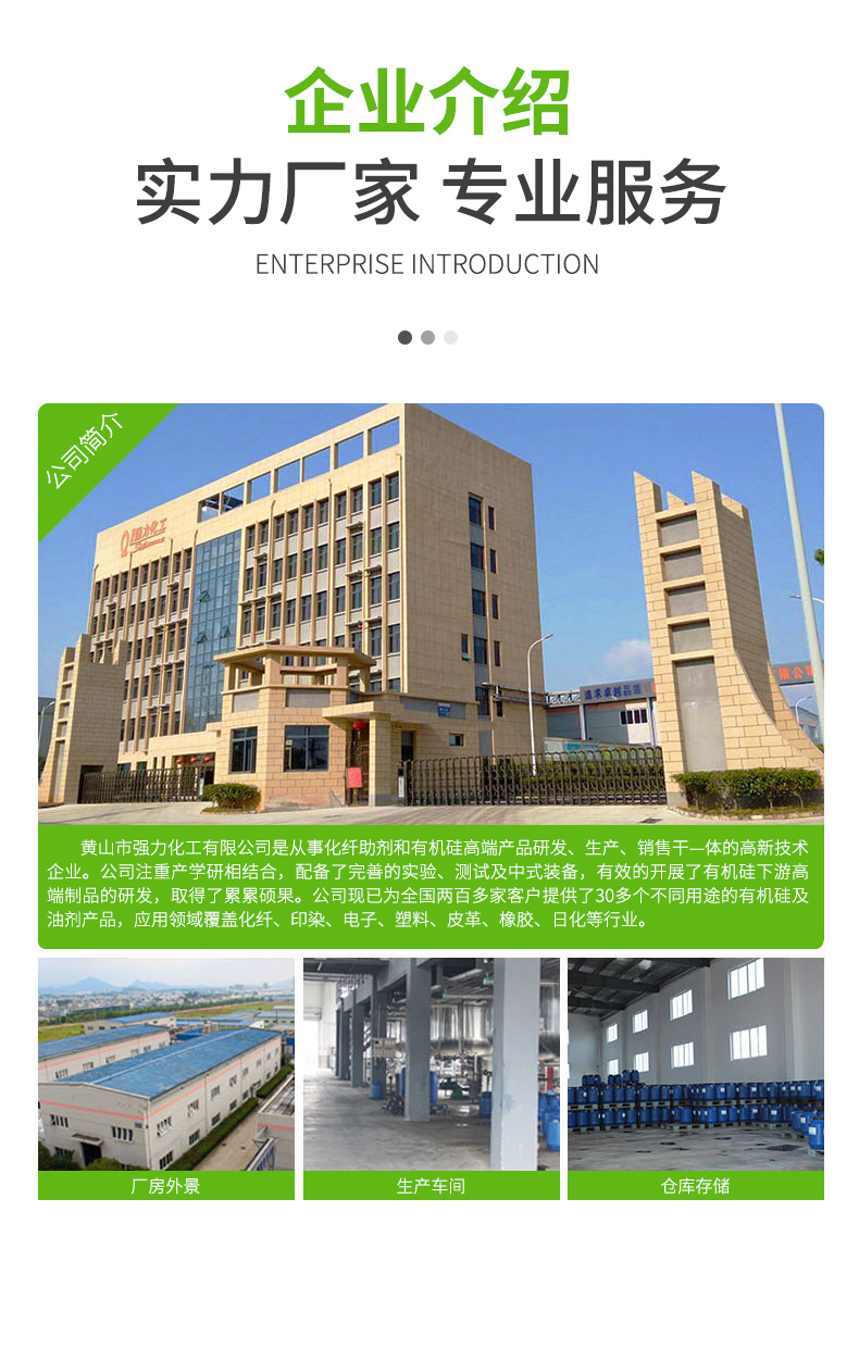 黃山市強(qiáng)力化工有限公司是一家專(zhuān)注于有機(jī)硅新材料,集研發(fā)、生產(chǎn)與銷(xiāo)售為一體的綜合性高新技術(shù)企業(yè)。公司已是有機(jī)硅行業(yè)內(nèi)較為知名的品牌,傾力于打造高品質(zhì)有機(jī)硅產(chǎn)品:二甲基硅油、乙烯基硅油、氨基硅油、乳化硅油、羥基硅油、含氫硅油與紡織品硅油等。砥礪前行,踔厲奮發(fā),強(qiáng)力純硅油,更高技術(shù),更好硅油。