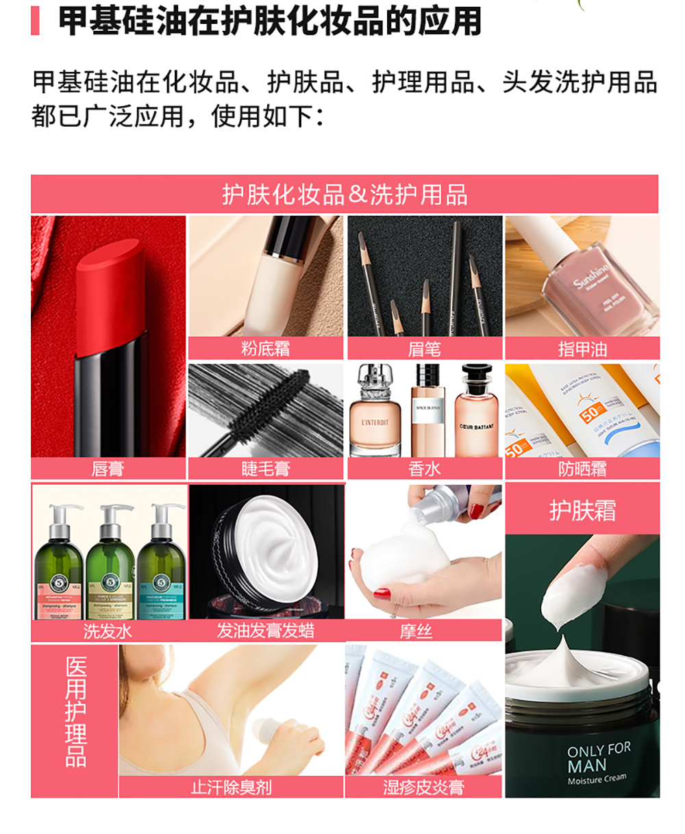 聚二甲基硅氧烷可用作潤滑劑、脫模劑、消泡劑、柔軟劑、防震劑、絕緣劑、光亮劑、填縫劑、防潮劑、介電液等,被廣泛應用在醫(yī)療、食品、日化、家具、建材、紡織皮革、塑料橡膠、電子電氣、汽車等行業(yè)中。