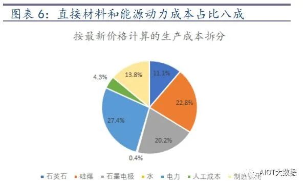 直接材料和能源動力是工業(yè)硅主要的成本構成,直接材料包括:硅礦石、石油焦、硅煤、石 墨電極等,能源動力包括:煤炭、電力。以合盛硅業(yè) 2021 年工業(yè)硅生產成本拆分看,直接材料 占比 46%、能源動力占比 32%。我們按照最新的原材料價格測算新疆工業(yè)硅企業(yè)成本構成,石英 砂占比 11%、硅煤占比 23%、石墨電極 20%、電力占比 27%。
