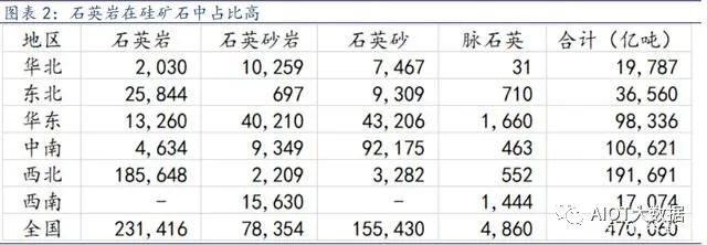 工業(yè)硅的上游原料是硅礦石,自然界的石英巖、石英砂、石英砂巖、脈石英等硅質原料統(tǒng)稱 為硅礦石,生產工業(yè)硅的原材料主要是石英巖。從中國硅礦石資源類型看,石英巖查明資源儲量 23.1 億噸,占比 49%,主要分布在青海和陜西;石英砂儲量 15.5 億噸,占比 33%;石英砂巖儲 量 7.8 億噸,占比 17%;脈石英儲量 0.5 億噸,占比 1%。